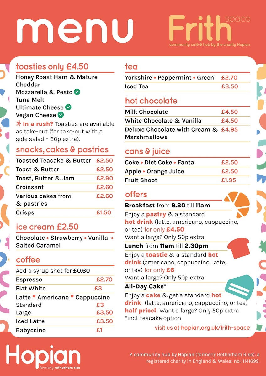 Welcome to Frith Space - Community Space Rotherham, a charming café nestled in the heart of Rotherham. Here, the menu is a delightful blend of quality and comfort, catering to all tastes. Starting with aromatic Yorkshire tea and refreshing iced teas, you'll find yourself sipping on local favorites. For a satisfying snack, indulge in a toasted teacake or a flaky croissant, perfect companions to the café’s inviting atmosphere.